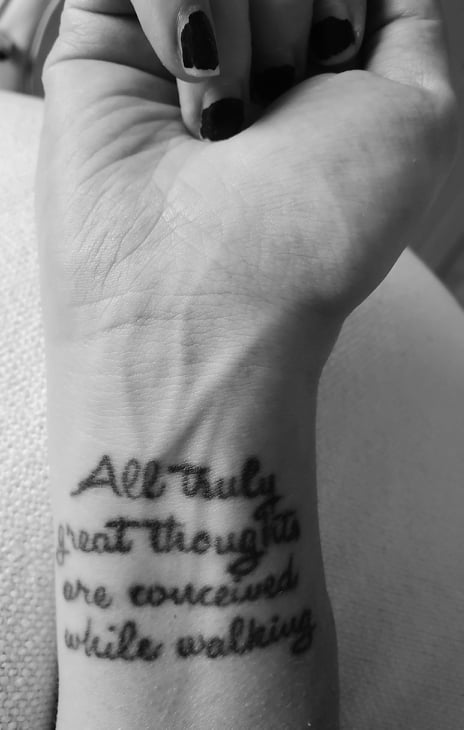 A greyscale photo of a clenched, inner right-hand wrist. Tatooed in black, loose cursive, handwritten-style text is: All truly great thoughts are conceived while walking.