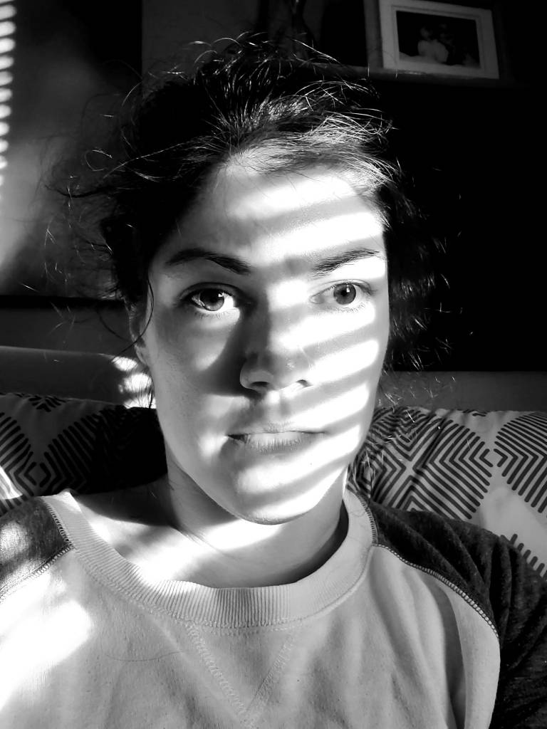 Self-taken headshot. I am looking straight into the frame. The image is in grayscale to accentuate the rays of light that limn the right side of my face. The light pierces through a window with blinds drawn closed. The window is out of frame.