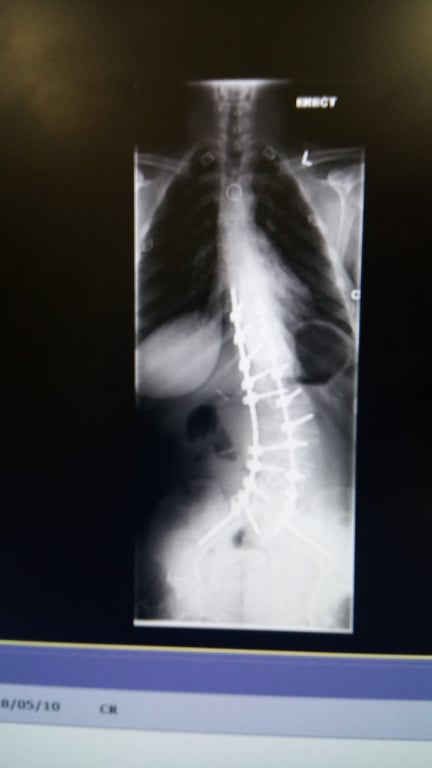 Patient has undergone an extensive spine surgery with the imposition of titanium instrumentation with screws from T9-S2 across the pelvis, multiple-level facetectomies and bilateral laminectomies [as well as] diskectomies In addition, patient has undergone interbody fusion with bone grafting for correction of a severe spinal deformity.