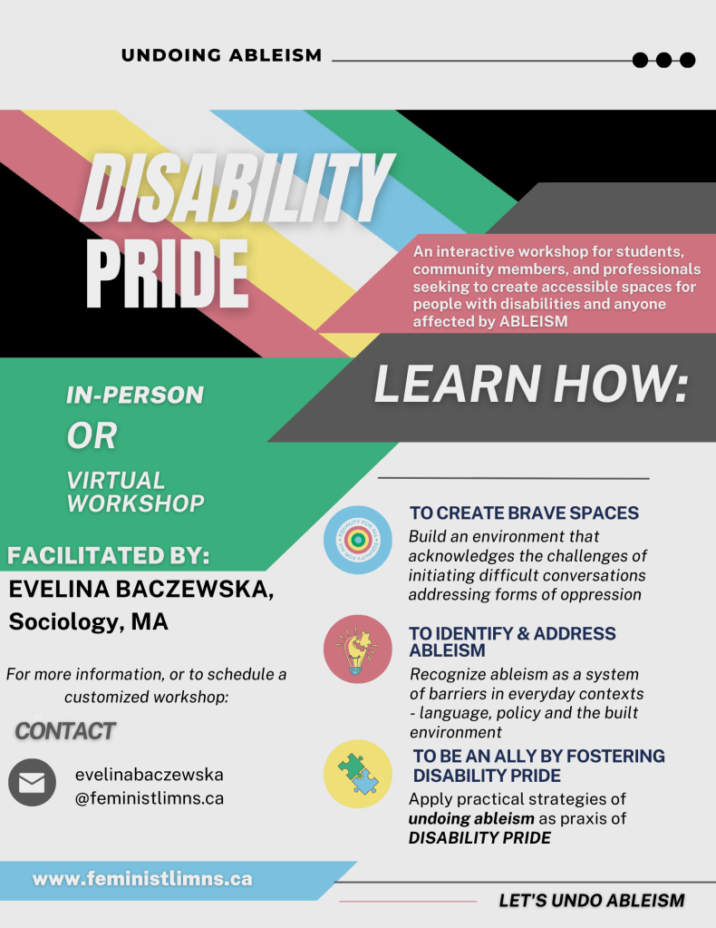 Let’s Undo Ableism! Offering an insightful, interactive DISABILITY PRIDE workshop for students, community members, and professionals seeking to create accessible spaces for people with disabilities, and anyone affected by ABLEISM. LEARN HOW: • TO CREATE BRAVE SPACES Build an environment that acknowledges the challenges of initiating difficult conversations of addressing forms of oppression. • TO IDENTIFY & ADDRESS THE LIVED CONSEQUENCES OF ABLEISM Recognize ableism as a system of barriers in everyday contexts – language, policy, the built environment, etc. • TO BE AN ALLY BY FOSTERING DISABILITY PRIDE Apply practical strategies of undoing ableism as praxis of DISABILITY PRIDE.